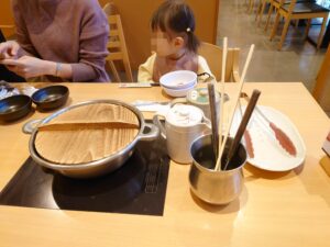 わが家は、ヘルシー大家鶏ランチ(150 g,1,300円)と牛豚バラミックスランチ(150 g, 1,490円)でバランスよく色々な肉を食べれるチョイスをしました。そして、鍋の種類は、すき焼きとしゃぶしゃぶが選べるのですが、子供が好きそうなすき焼きを選びました。