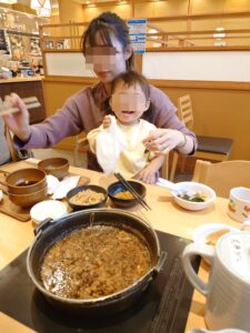 同フロアにある串家物語と違って、ちゃんとベビーチェアーが用意してあって、子連れに対してケアをする姿勢が垣間見えるのが良いです。