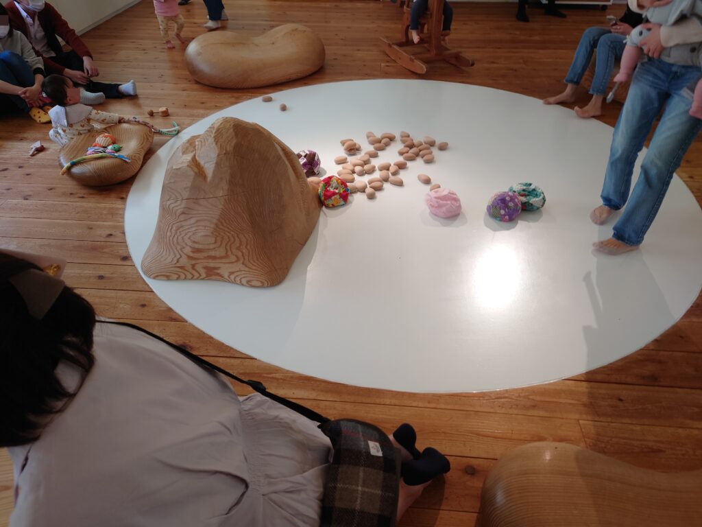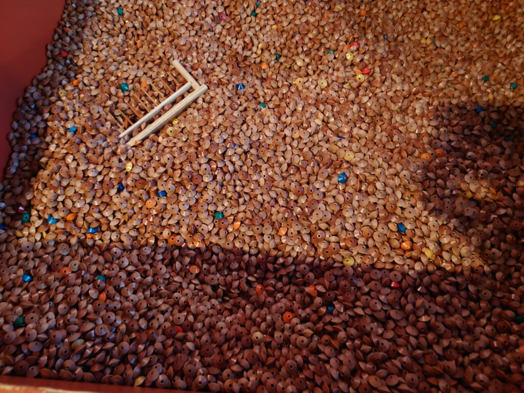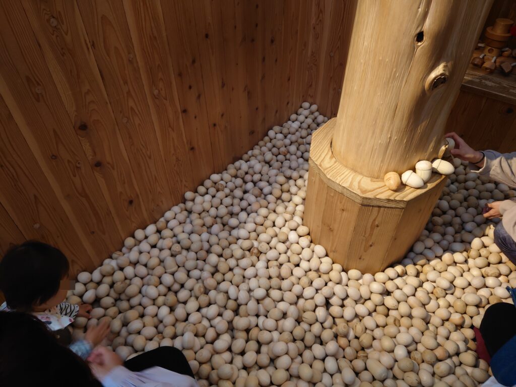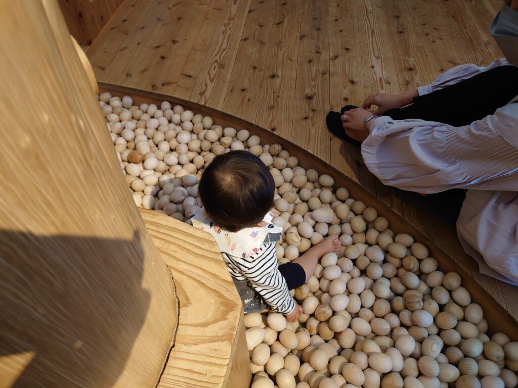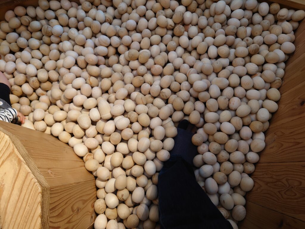 - 木のボールプールは温もりがあり、普通のボールだけでなく、どんぐり型のボールも混ざっていました