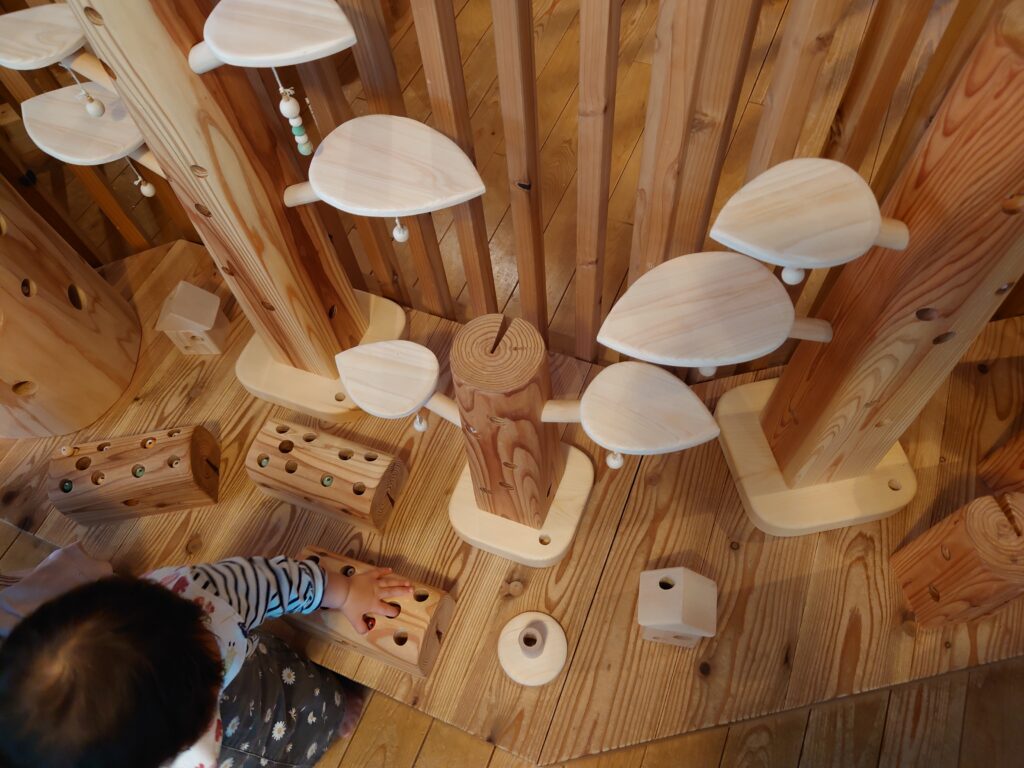 - 木の回廊は昇る人と降りる人が途中でかち合うとちょっと面倒なんですが、そこを昇り切った後の踊り場は、歩き始めて1ヶ月位の我が子でも安全に楽しく遊べる空間になっていました。