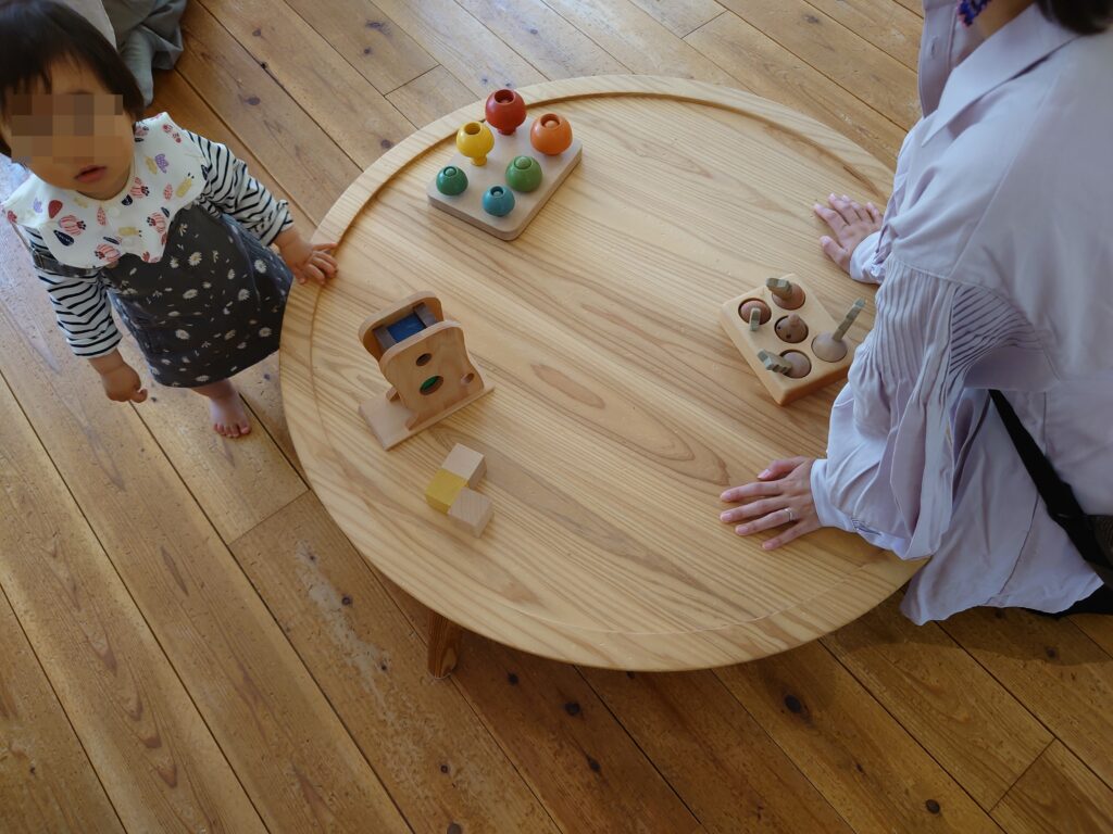 後述する「赤ちゃん木育ひろば」は時間制限があり、10:40からしか入館できなかったので、先に2Fにある「おもちゃのもり」で遊びました。